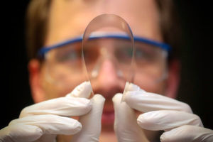 Beim Einsatz von Glas anstelle von Silizium könne das Tempo beim Datentransfer von Prozessoren aufgrund der höheren elektronischen Isolation im Vergleich zum bisherigen Stand der Technik verachtfacht werden, sagt Sprengard. Eine zehnmal so hohe Geschwindigkeit sei beim Datentransfer von Speicherbausteinen möglich. Der eigentlich sehr spröde Werkstoff Glas kann durch chemische Eingriffe wie den Austausch von Ionen sowie spezielle Schneid- und Produktionstechniken extrem dünn und biegsam gemacht werden. Die Scheiben sind dann nur noch 50 Mikrometer dick - das entspricht etwa einem menschlichen Haar. In den Laboren werde aber bereits an der Entwicklung von Dünnstgläsern mit zehn Mikrometern gearbeitet, erzählt Schott-Forschungsvorstand Hans-Joachim Konz.