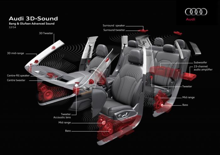 Beim Bang & Olufsen Advanced Sound System steuert der digitale Signalprozessor elf Kanäle mit insgesamt 23 Lautsprechern an – und zwar so, dass der Sound auf jedem Sitzplatz gleich präzise und harmonisch ist. Vier Lautsprecher, in den A-Säulen untergebracht und über jeweils eigene Kanäle versorgt, übertragen jene Anteile, aus denen sich die räumliche Höhe ergibt. Neuentwickelte Lautsprecher wie beispielsweise ein von 200 Millimeter auf 250 Millimeter vergrösserter Subwoofer und ein neuer Verstärker mit jetzt 1920 Watt garantieren laut Audi