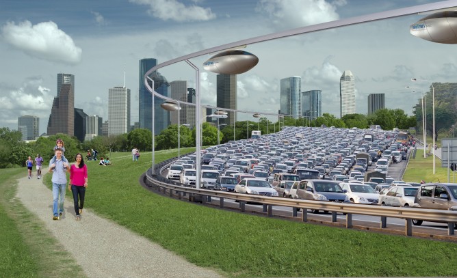 The skyTran system will soar above cars stuck in traffic.