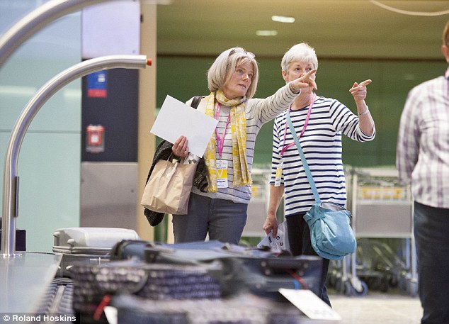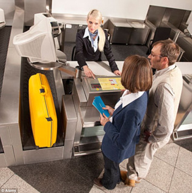 Passengers can already generate their own boarding pass at home or on their mobile phones but have to stand in line to deposit their bags to get a receipt (picture posed by models)